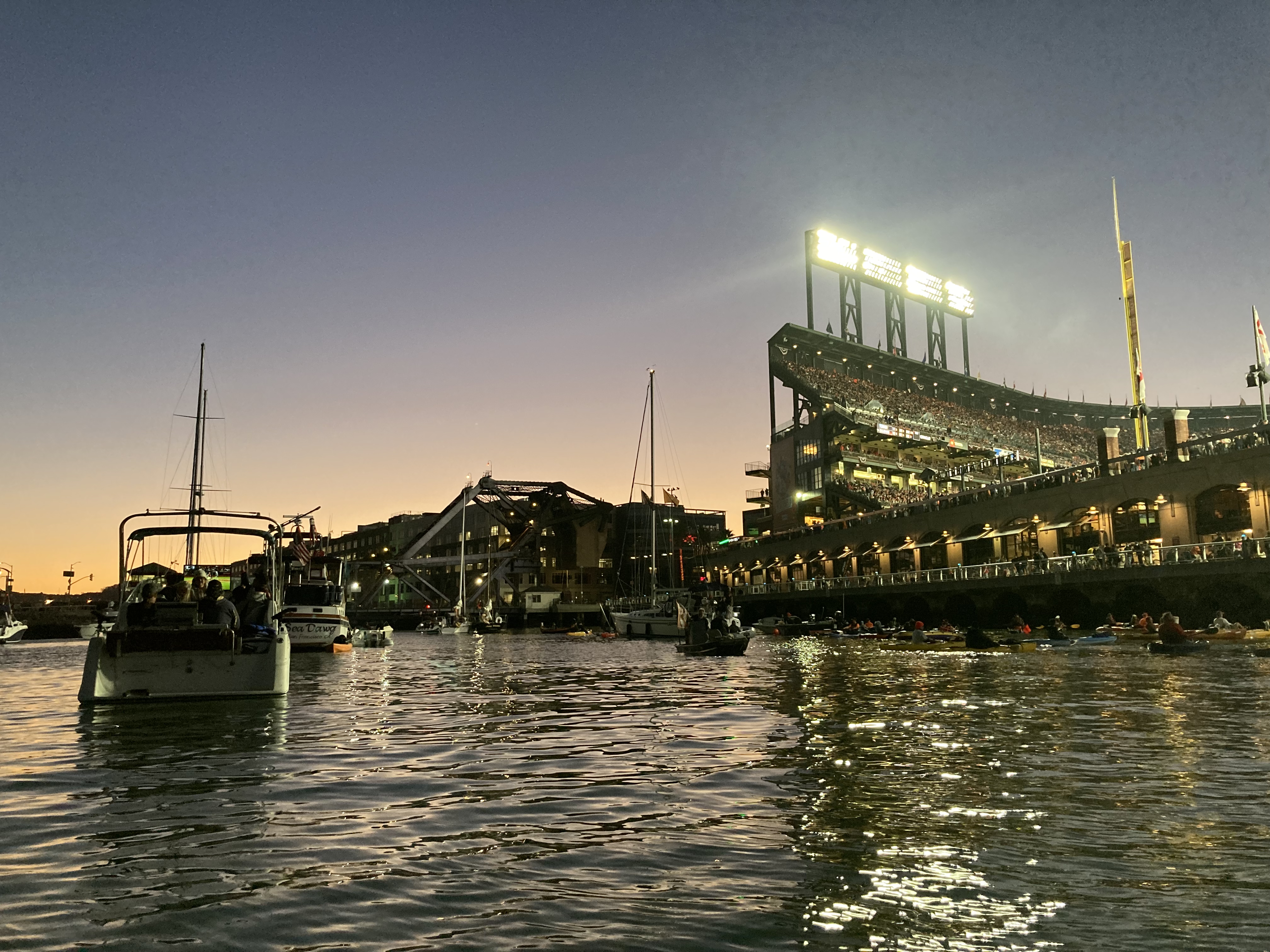 It was a Saturday afternoon and the Giants were playing the Dodgers at Oracle Park. A whole side of the stadium is open to McCovey Cove, a pocket of the San Francisco Bay, and just the night before, I had learned about the phenomenon known as a splash hit. It’s when a batter, usually a leftie, hits a home run out of the park and the ball lands in the water. Then suddenly, a flurry of fans on kayaks and motorboats swoop in to vie for the ball. These aren’t fans who paid for a ticket; they can’t even see the baseball field from the cove. They’re specifically there to grab a splash hit. And that’s how my friends and I found ourselves floating on a boat.